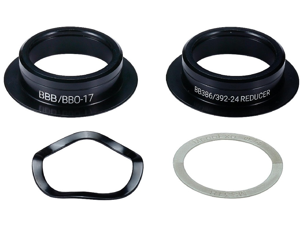 Redukcia BBB BottomAdapt umožňuje montáž stredového zloženia s priemerom osi 24 mm do misiek BB386 EVO. Redukcia je vyrobená z duralu a jej súčasťou sú vymedzovacie podložky.