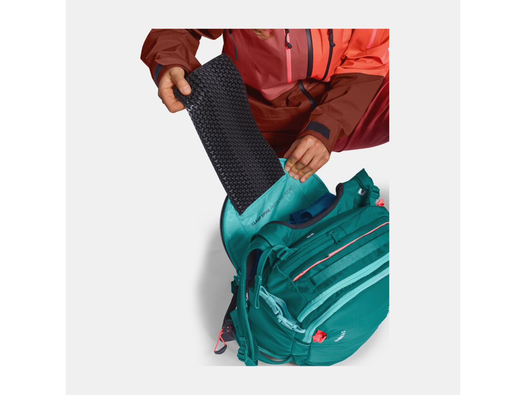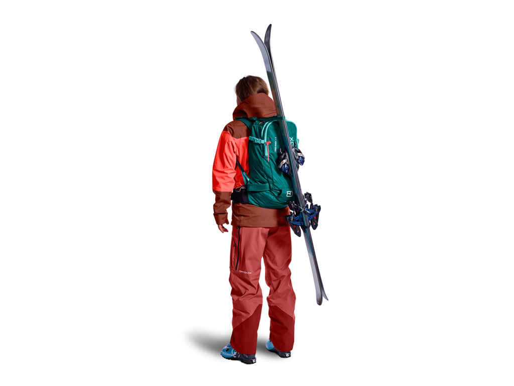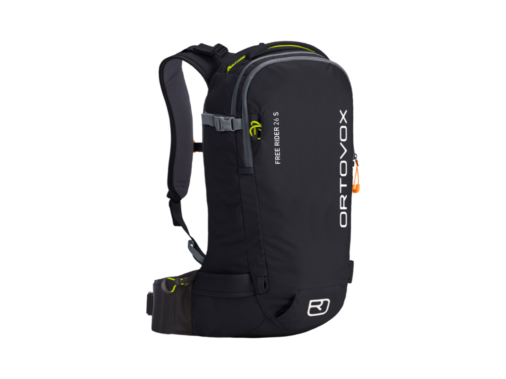 ORTOVOX Free Rider 26 l je určen jak pro lyžaře, tak pro snowboardisty, kteří chtějí batoh na ty nejnáročnější sjezdy. Chlubí se možností vložení certifikovaného chrániče páteře Clasp Spine Protector (chránič není součástí balení) pro vaši maximální ochranu.  Hmotnost batohu je pouhých 1000 g. Má široký bederní pás, který snadno nastavíte a následně dotáhnete pomocí integrovaného stahovacího systému Clasp Flex Blet. Široké a pohodlné ramenní popruhy lépe rozloží hmotnost batohu mezi vaše ramena, záda a bedra. Zádový systém je tvořen vycpávkami z paměťové pěny v 6 zónách. Do hlavní komory se dostanete přes záda. Jednoduše položíte batoh čelem do sněhu a otevřeš jako kufr – vše je přehledně vidět. Naleznete zde přihrádku na rezervoár vody a výstup na hadičku, která vede do ramenního popruhu. Komora je dostatečně prostorná na vybavení, které potřebujete udržet v suchu. Druhá komora slouží jako bezpečnostní lavinová kapsa. Mokré vybavení je pak oddělené od zbytku věcí. Kapsa má úmyslně oranžová poutka zipů, aby byla ihned na očích v případě nouze. Ve spodní části batohu je možnost uchytit přilbu.
