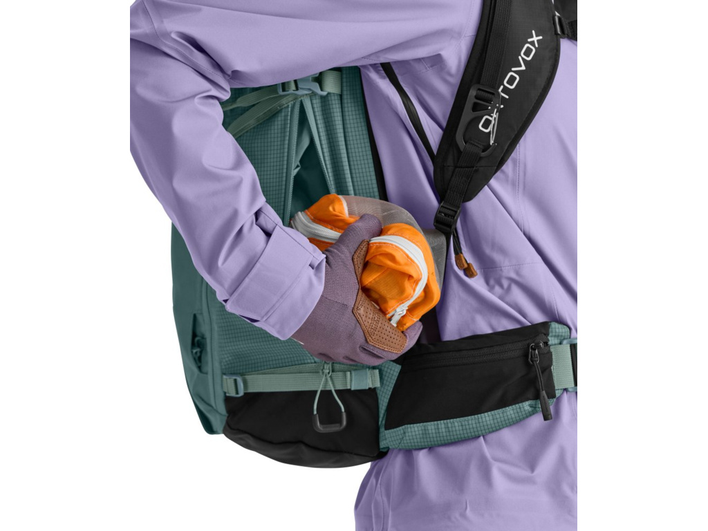 Lavinové vybavení a lehký cepín uložený v samostatné bezpečnostní přihrádce lze v případě nouze rychle vyndat, zatímco všechny věci v hlavní přihrádce jsou přístupné přes plně otevírací záda. Díky speciální boční kapse máš mačky a stoupací pásy vždy po ruce i bez nutnosti sundávání batohu. Taky lano a lyže snadno sundáš i s batohem na zádech. Uchycení pro dva lezecké cepíny, daisy chain, uchycení na lano a síťka na helmu doplňují všestranné možnosti upevnění vybavení.