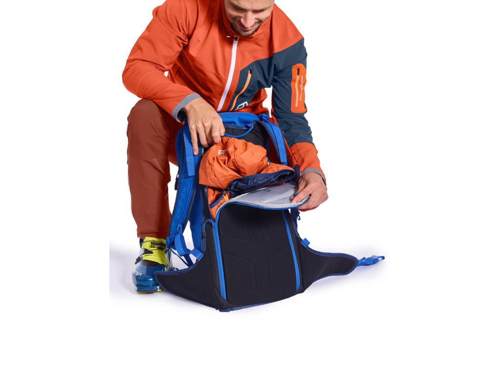 - Oddelené predné vrecko na lavínovú výbavu s výrazne označeným pútkom zipsu pre rýchlu orientáciu počas núdzovej situácie.