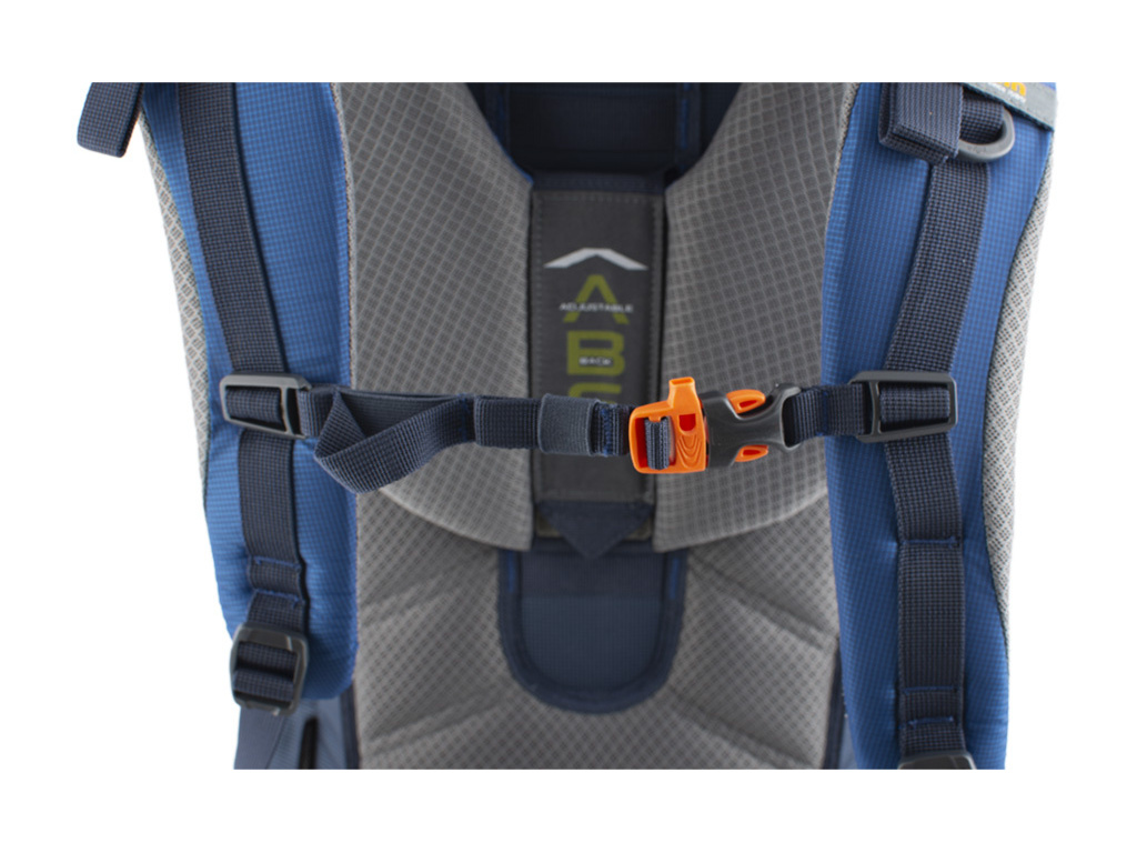 Výškovo nastaviteľný, pohodlný, šitý chrbtový systém ABS s vankúšikmi potiahnutými 3D mesh priedušnou textíliou zaisťuje efektívne odvetranie chrbta pri zachovaní optimálneho rozloženia nákladu. Chrbát plecniaka je vystužený párom duralových výstuží a HDPE doskou, ktorá pomáha rozložiť hmotnosť prepravovaného nákladu na chrbát a eliminuje tlaky prepravovaných predmetov do chrbta. Pevné ramenné popruhy so zosilneným polstrovaním slúžia na zachovanie komfortu aj pri transporte ťažkého nákladu. Výstup na hadicu vodného vaku je medzi hornými balančnými popruhmi.
