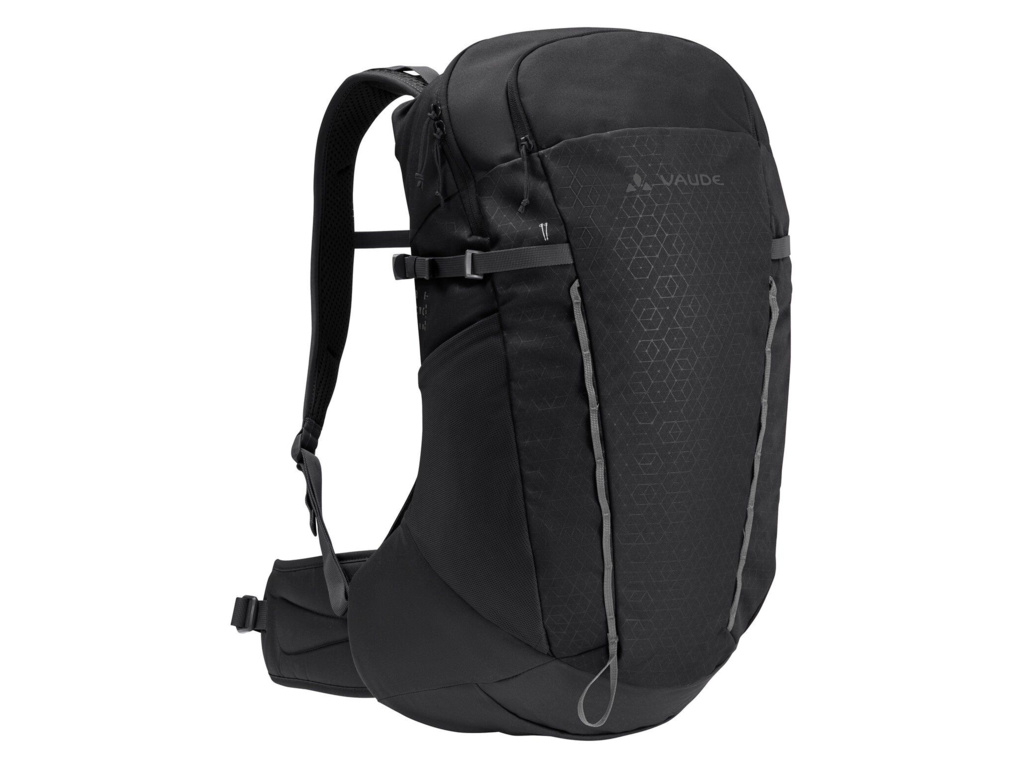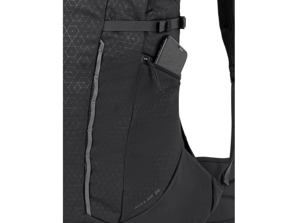 Hlavní přednost turistického batohu Agile Air 26 l se projeví v horkých letních dnech: zadní odvětrávaný nosný systém Aeroflex 3D vytváří mezi batohem a zády prostor otevřený ze tří stran. To umožňuje cirkulaci vzduchu na všech stranách a výrazně snižuje hromadění tepla. Výbava nenechává nic náhodě ani při celodenních túrách a v každodenním životě: na palubě je polstrovaná přihrádka na sluneční brýle a smartphone, elastická síťovaná kapsa na boku a držák na trekové hole. S objemem 26 litrů nabízí turistický batoh dostatek místa na oblečení do deště a na převlečení, svačinu a vodu i na drobnosti, jako je peněženka, GPS atd. Další vybavení lze připevnit na dva popruhy s poutky. Ramenní popruhy Ergoshape pohodlně sedí a neškrtí, zatímco bederní pás zajišťuje stabilní přenos nákladu. Označení VAUDE Green Shape znamená ekologický a funkční výrobek vyrobený z udržitelných materiálů s certifikací bluesign®.