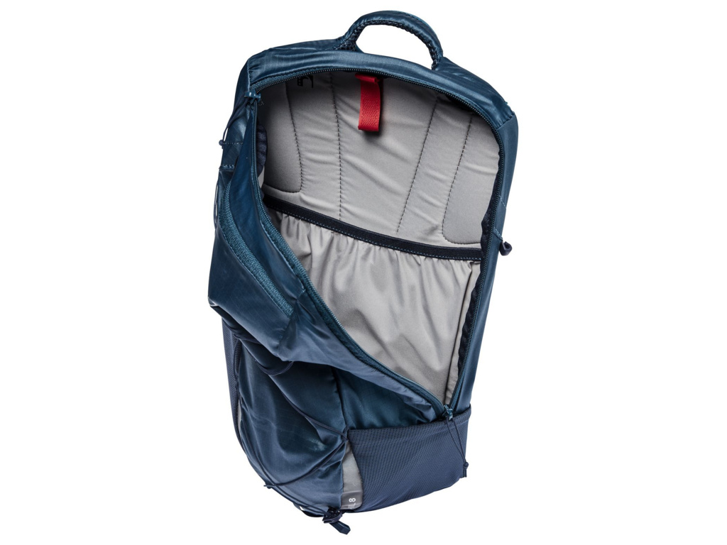 Vďaka minimalistickým funkciám je batoh pohodlný. Hlavná komora s asymetrickým otváraním ponúka objem 8 litrov; ploché, pružné sieťované vrecko a bočné vrecko na zips poskytujú prístup k telefónu alebo desiate bez toho, aby ste museli batoh dávať dole.