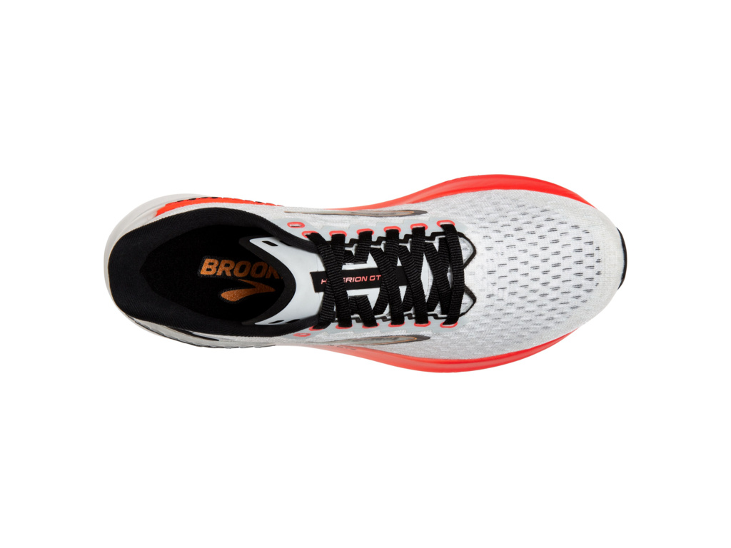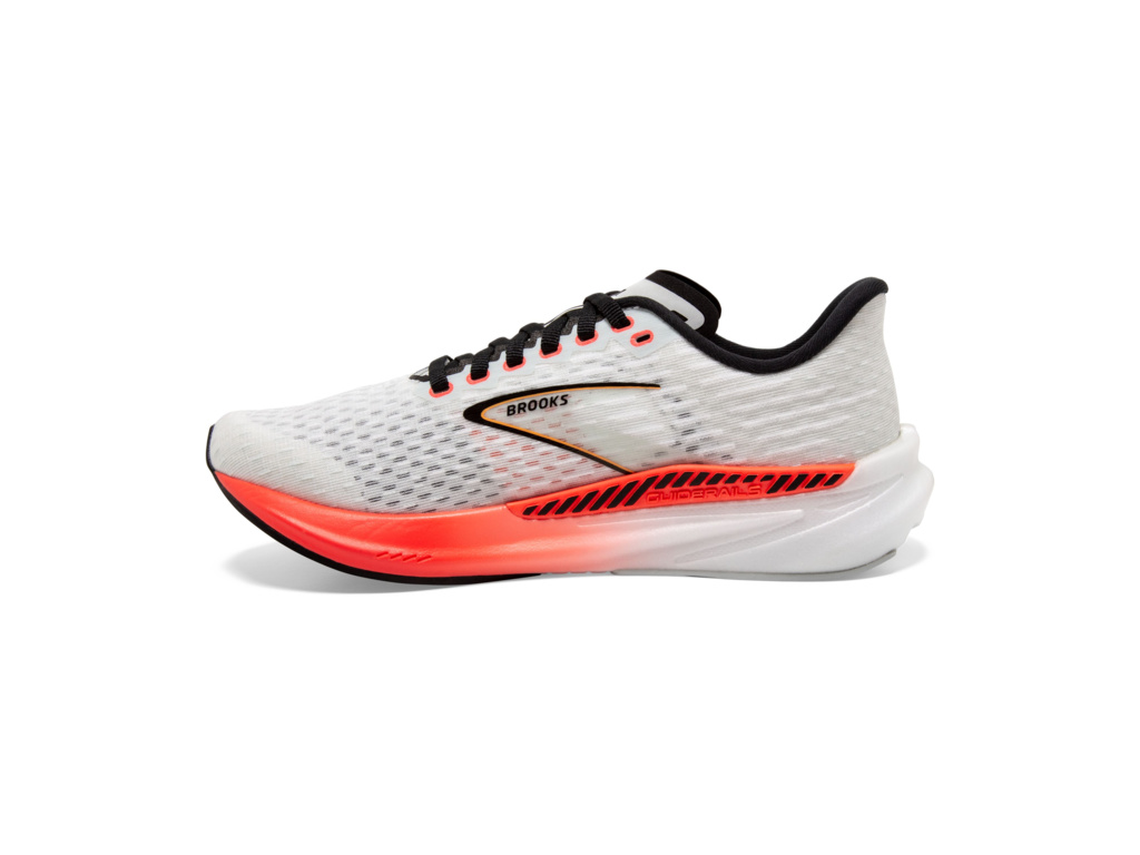 BROOKS Hyperion je responzívny model stavaný na tempové tréningy a preteky. 230 gramov rýdzeho výkonu. Hyperion GTS je úžasne ľahká topánka, ktorá by sa ale mala liečiť s agresívnym správaním. Nenechá vás totiž ani na okamih vydýchnuť. Prepracovaná geometria spoločne s dusíkom poháňanou penou DNA FLASH kope do odrazu tak rýchlo, že budete mať čo robiť, aby ste jej stačili. Mohutnosť a vnímavosť celej topánky je pritom na takej úrovni, že skvele podrží aj tam, kde sa nejedna závodná topánka zadrháva. Reč je predovšetkým o úsekoch v ostrých zákrutách atletického oválu, alebo o tempovom behu po rozbitom asfalte. Hyperionu vo verzii GoToSupport dodáva ešte lepšiu stabilitu a ovládateľnosť unikátnej technológie GuideRails. Nečakajte žiadne pevné výstuhy a agresívnu snahu o korekciu došľapu, ktorú môžete poznať z väčšiny tzv. Pronačných topánok. GuideRails šetrne podporuje prirodzené pohybové vzorce tvojho tela a poskytuje oporu iba tam a vtedy, kde je to skutočne nutné. Výsledný efekt pozitívne pocítia vaše členky, kolená aj boky. Novo vyladená medzipodrážka DNA FLASH zaistí topánke veľkú nálož energetickej návratnosti. Podiel na tom nesie dusík, ktorý je vstrekovaný do tlmiacej peny vo výrobnom procese, odľahčí ju a predĺži jej životnosť. Mäkké a vysoko energetické tlmenie zmierňuje únavu počas ťažkých tréningov a vy tak môžete trénovať ešte intenzívnejšie. Zvršok je tvorený kombináciou pleteniny a meshu, aby bol pevný na nohe, vysoko priedušný a ľahký ako pierko. Všitý jazyk so zónovými výstuhami umožní pohodlné utiahnutie chodidla a spoľahlivejší fit. Prepracovaná, strategicky rozmiestnená podošva z vysoko priľnavej gumy zlepšuje prechod z dopadu do odrazu. Hyperion tak drží ako pribitý za sucha aj za mokra, netrpí rýchlym opotrebovaním a nekladie žiadny odpor v prechodovej fáze kroku.
