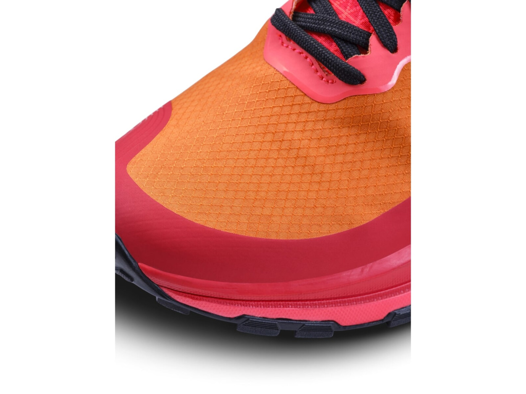 Trailová běžecká bota CRAFT Pure Trail X je vybavena Cr Foam™ (pěnou) v mezipodešvi, která poskytuje vysokou míru tlumení, stabilitu, výbušný odraz a to vše se sníženou hmotností. Pod střední a přední částí chodidla je rock plate, který zvyšuje stabilitu a ochranu chodila. Podešev se středně vysokým vzorkem spolehlivě zdolává i náročnější terén bez ztráty trakce. Svrchní materiál je vyroben z recyklovaného polyesteru a má ripstopovou úpravu pro zvýšení odolnosti proti roztržení. Ještě větší odolnost přináší okop boty s TPU.