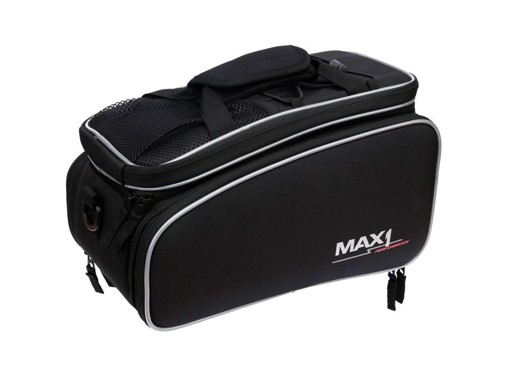 Viacúčelová taška Max1 Rackbag L s nastaviteľným objemom rozopnutím horného zipsu. Viacúčelová taška na nosič s nastaviteľným objemom (rozopnutím horného zipsu)Upevnenie na nosič pomocou suchých zipsovRelaxované bočné panely pre väčšiu stabilitu nákladuVeľké vnútorné vrecko na pršiplášťVonkajšia sieťka na drobnostiPopruh cez ramenoPasuje na väčšinu štandardných typov nosičovPlášť je súčasťou baleniaNa veku tašky sa nachádza elastická šnúrka na umiestnenie napr. Extra reflexné prvky v zadnej časti taškyRozmery tašky:Dĺžka: 32,5 cmŠírka: 15,5 cmVýška: 19 cm (merané v najvyššom bode)Objem tašky: 9,6 l