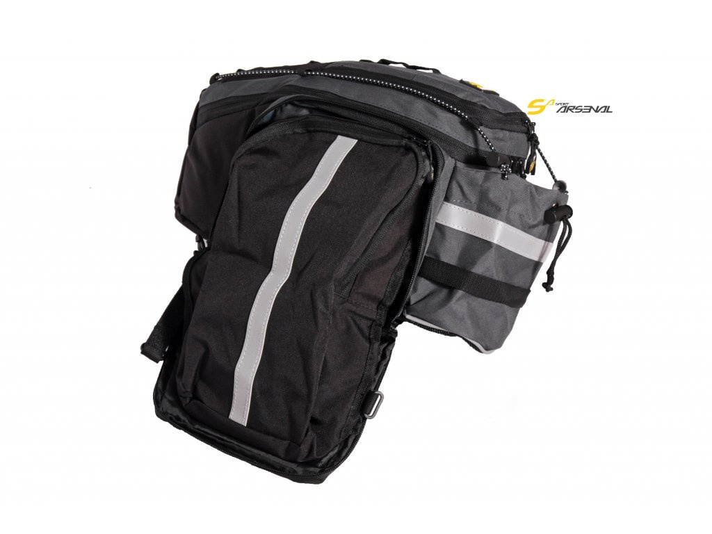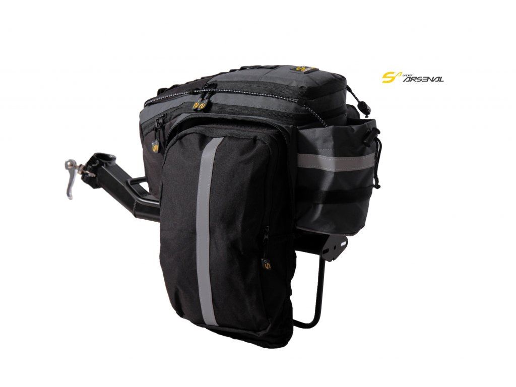 Univerzálna športová taška Arsenal Art bag. 560 na zadnom nosiči na menšie výlety, na cestu do práce alebo pre mladších rybárov. Hlavnou výhodou tašky je jej štruktúra a variabilita objemu. Zo stredne veľkej tašky môžete mať po otvorení bočných vreciek tašku s objemom až 20 litrov.  Vďaka kvalitnému spracovaniu, reflexným prúžkom a veľkému objemu je Art. 560 dokonalého partnera na cesty.