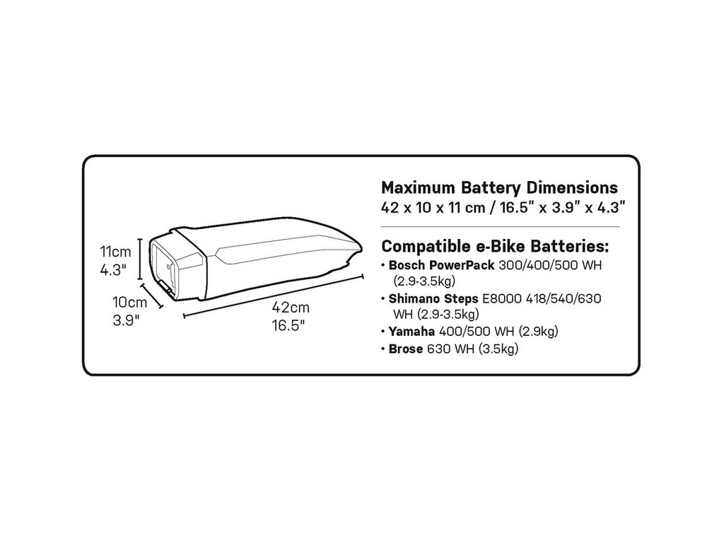 • kompatibilná s batériami Bosch 300 / 400 /500 WH, Shimano Steps E8000 418 / 540 / 630, Yamaha 400 / 500 WH, Brose 630 WH, resp. s batériami s max.rozmermi 42 x 10 x 11 cm