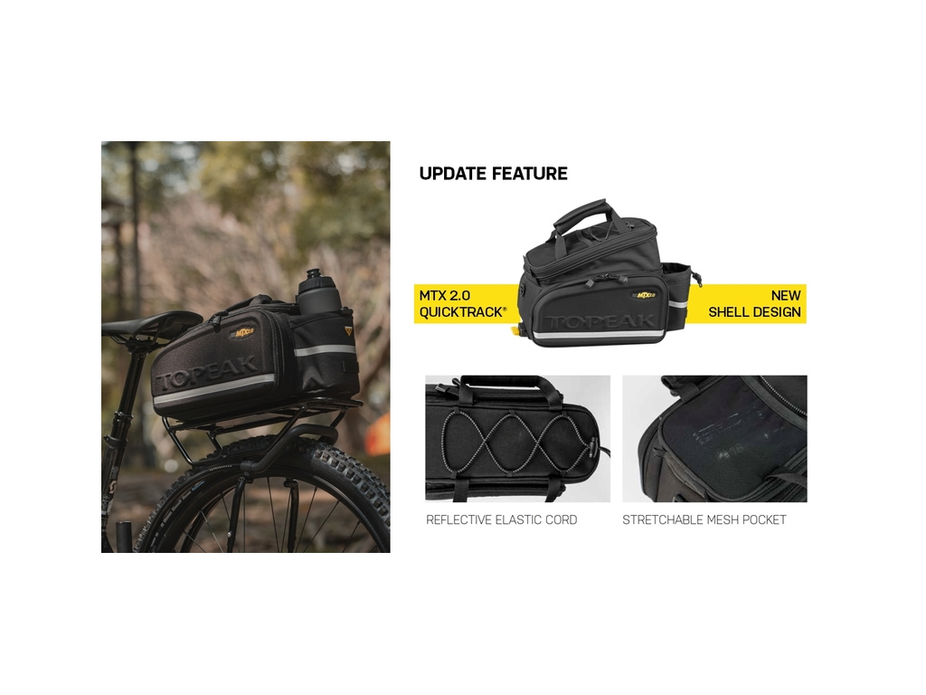 Novšia vylepšená verzia obľúbenej cyklistickej batožiny s veľkou kapacitou pre nosiče série MTX QuickTrack 2.0 system s bočnicami. Vylepšenie spočíva v novej upínacej platforme MTX QuickTrack 2.0 system (používaná na nosičoch TOPEAK série TUBULAR, UNI, TETRA RACK), uhladenejšom vonkajšom dizajne, reflexných prvkoch na napínacom lane a elastickom sieťovinovom vrecku na vrchnej strane batožiny.