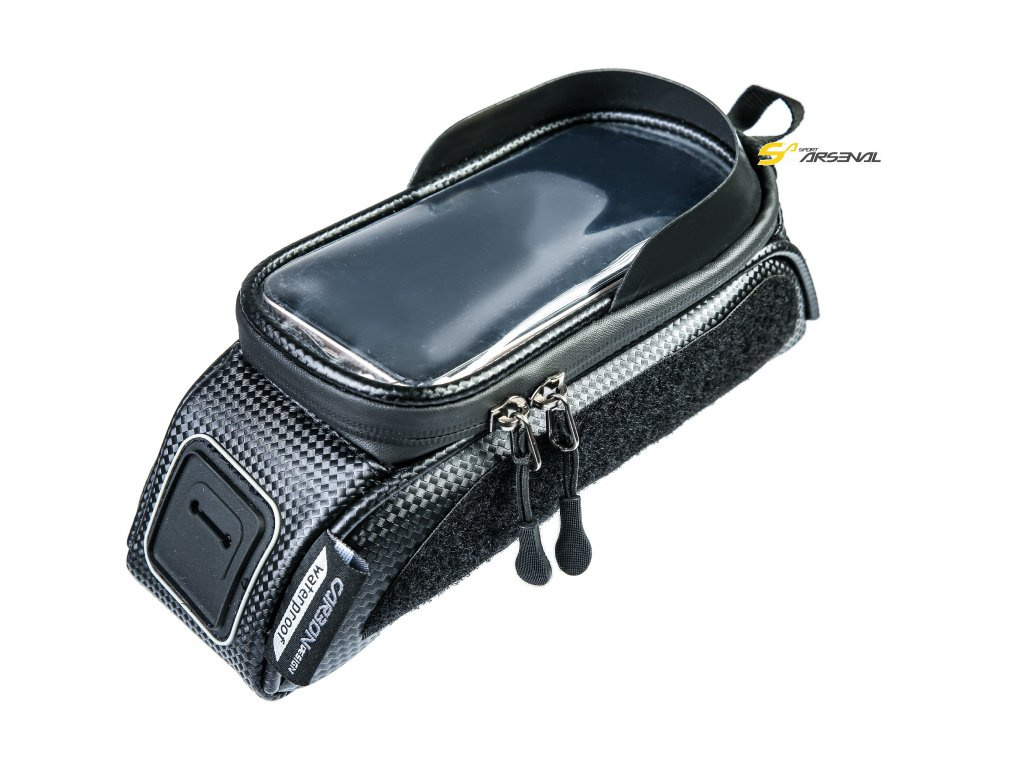 Taška na hornú trubku s vreckom na mobilný telefón z moderného materiálu CarbonDesign. Praktická objemná taška na všetky potrebné veci, ktoré je potrebné mať na očiach (mobilný telefón, kompaktný fotoaparát, peňaženka, kľúče, sušienky).