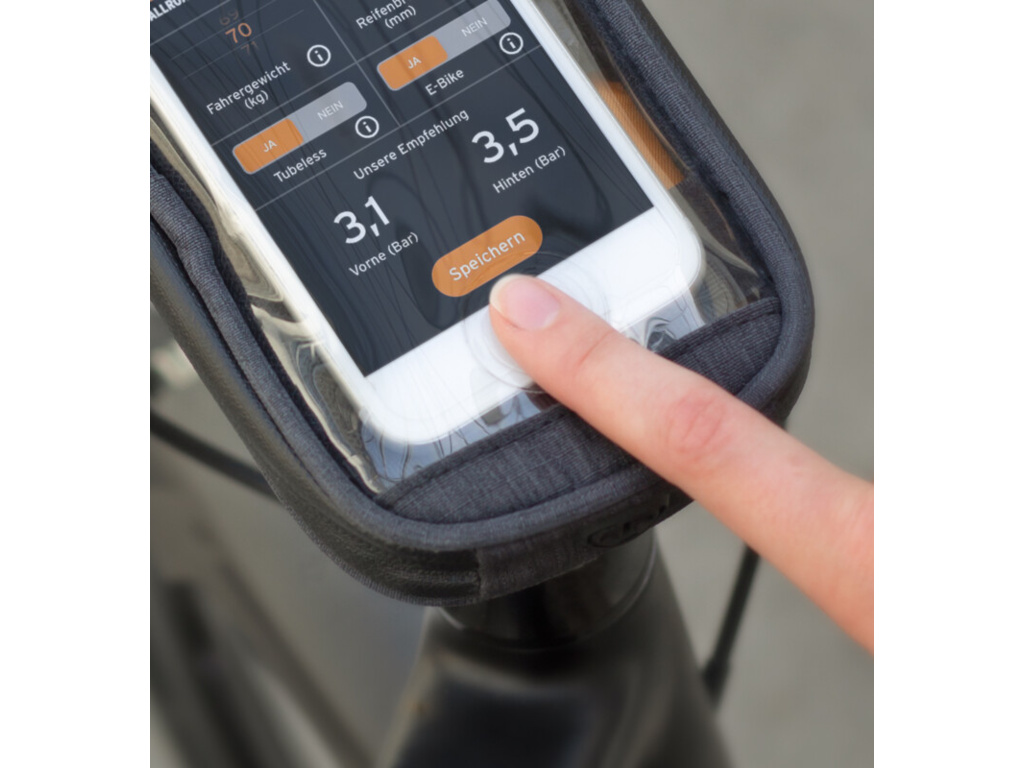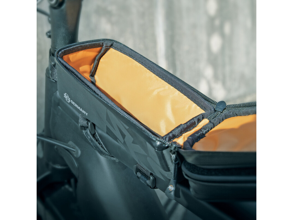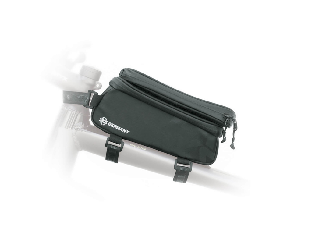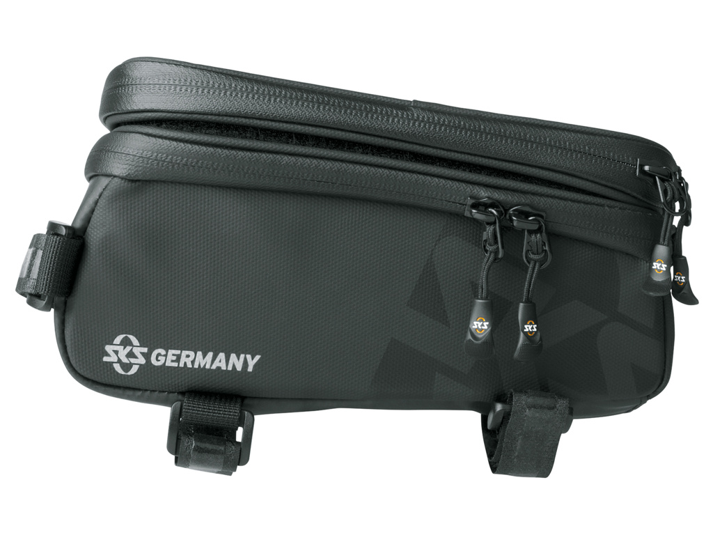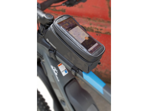 Inteligentná rámová cyklo brašna SKS Explorer Smart s oddeliteľným púzdrom na telefón kompatibilná s dotykovými displejmi a integrovaným vreckom na drobnosti. Taška je vyrobená z pogumovanej vodeodolnej tkaniny.