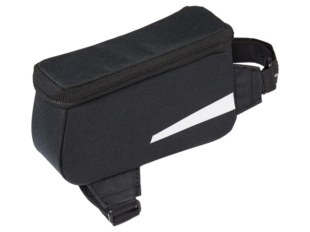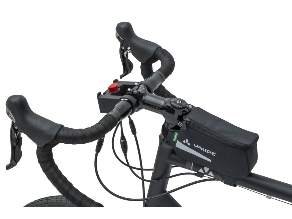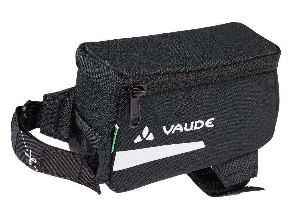 Čierna taška na hornú trubku VAUDE s mäkkým vnútorným polstrovaním na uloženie mobilného telefónu, energetickej tyčinky alebo peňazí z ekologického materiálu.