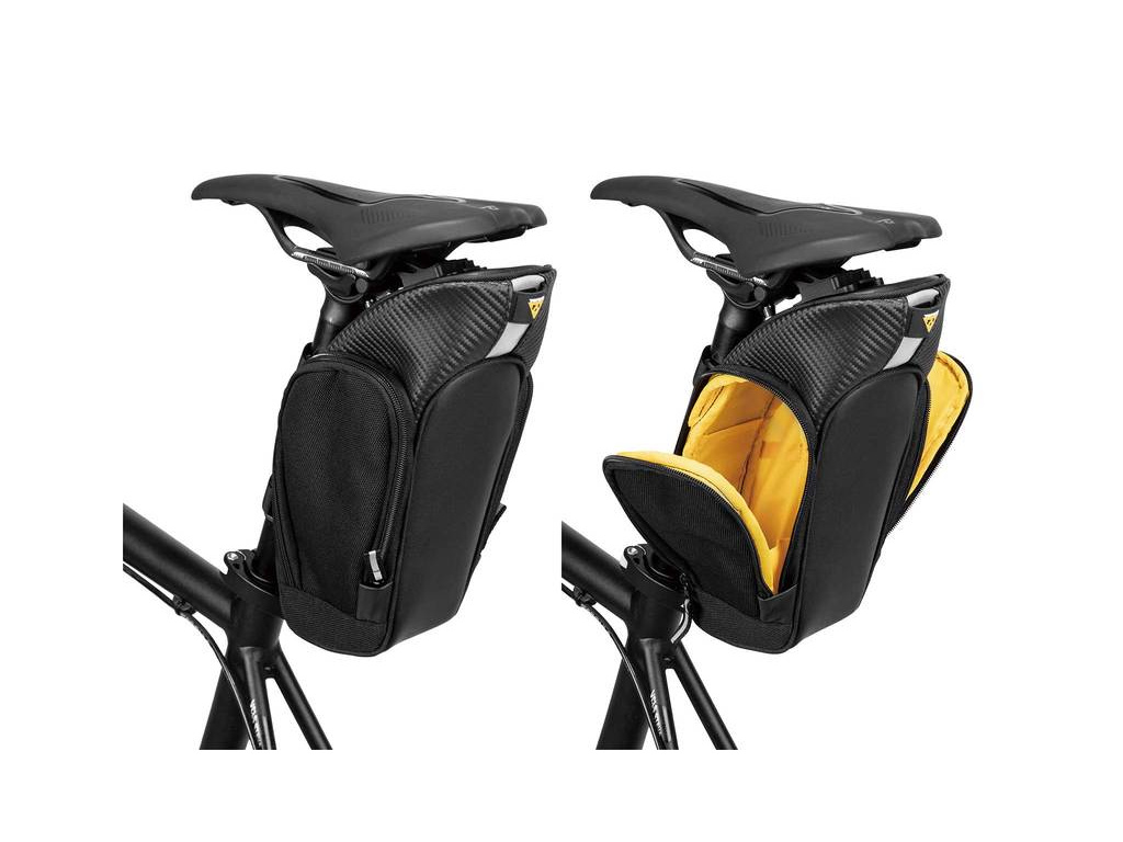 Veľká podsedlová taška s dvojitým bočným prístupom do hlavného úložného priestoru, vhodná na prepravu cyklistickej vesty, vetrovky, duší, náradia, atď.
