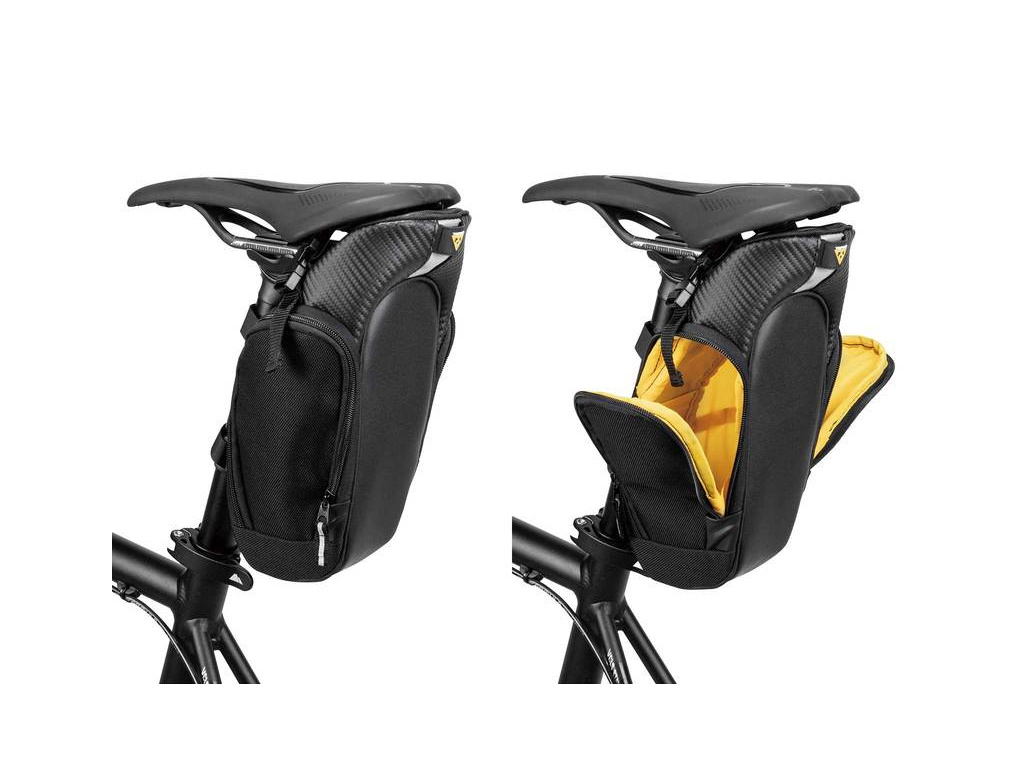 Veľká podsedlová taška s dvojitým bočným prístupom do hlavného úložného priestoru, vhodná na prepravu cyklistickej vesty, vetrovky, duší, náradia, atď.