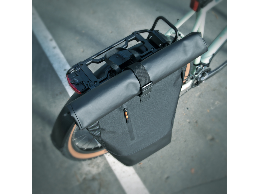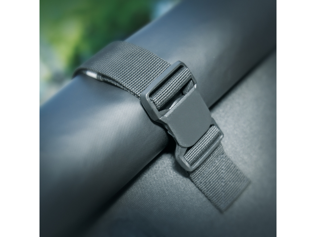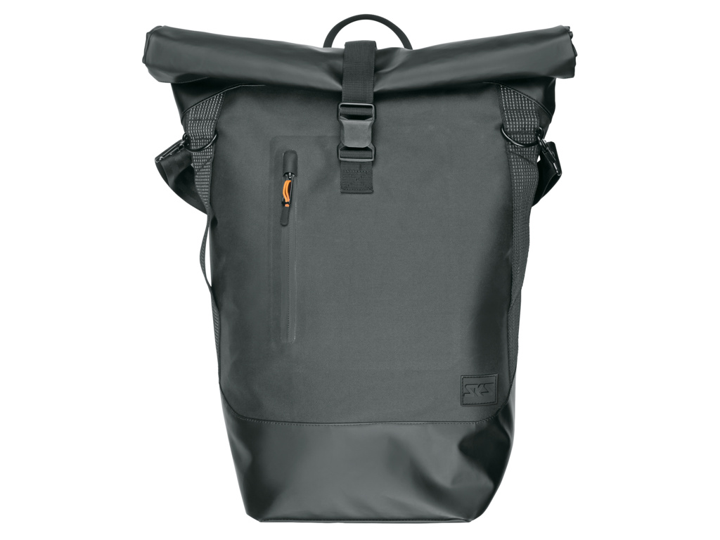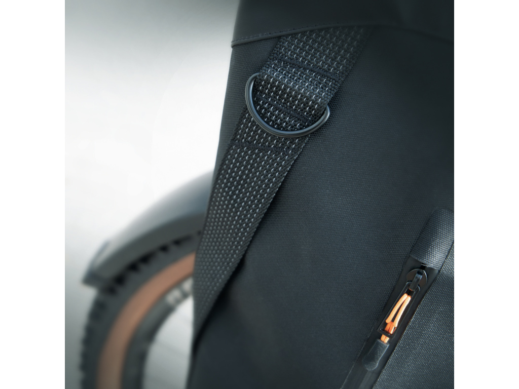 Rolovací uzáver so zipsom a magnetickým klipom umožňuje flexibilne upraviť veľkosť podľa obsahu. Kvalitný nepremokavý materiál a zvárané zipsy chránia obsah pred nepriaznivým počasím. Taška má spevnenú zadnú a spodnú časť, ľahko prístupné vonkajšie vrecko, reflexné prvky na bokoch a polstrovanú priehradku na notebook.
