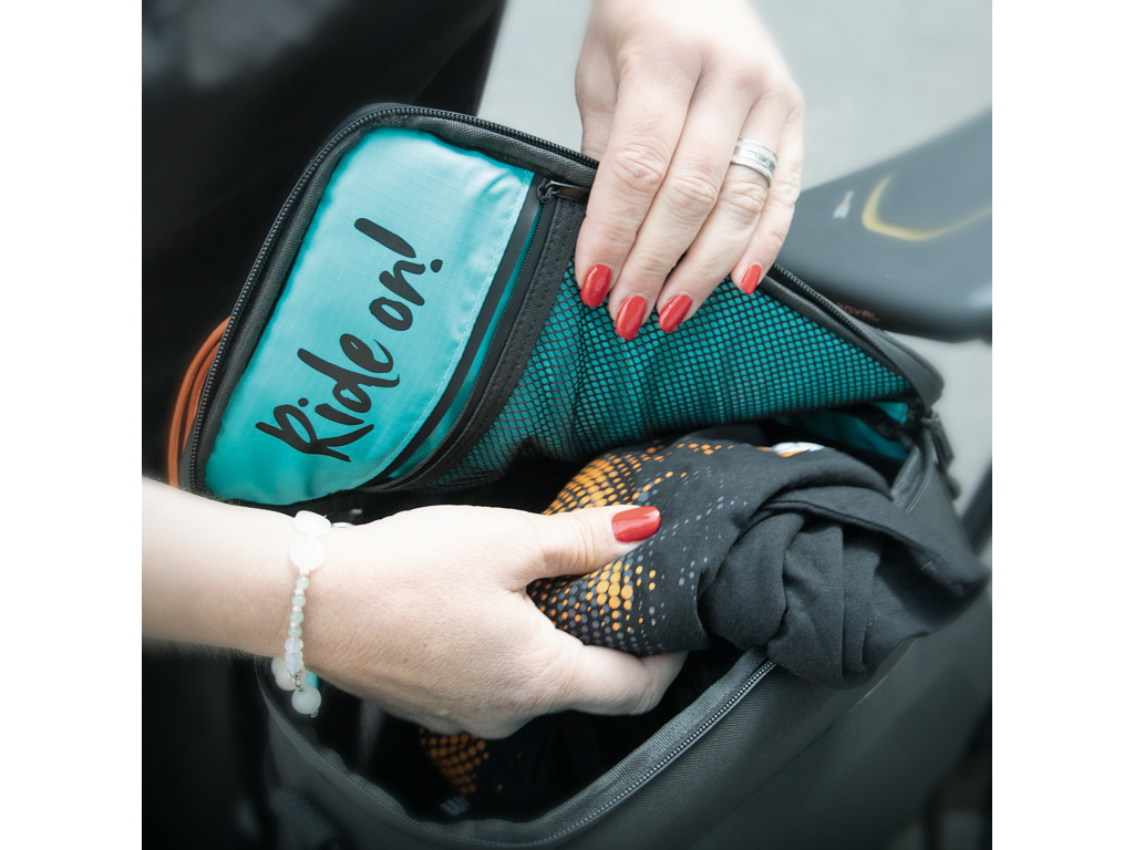 Už žiadny chaos vo vašej taške! Priehradka vzadu, vnútorná prepážka a sieťovaná priehradka v hornej časti tašky vytvárajú poriadok a umožňujú rýchly prístup. Vrch je možné úplne otvoriť pomocou zipsu Easyzip. Dvojitá sieťovaná kapsa pojme ďalšie drobnosti. Reflexné pútka sú pripevnené na prednej a zadnej strane pre lepšiu viditeľnosť v cestnej premávke. Robustná rukoväť a ramenný popruh uľahčujú prepravu tašky, aj keď bicykel nepoužívate. Rozsiahlu výbavu dopĺňa praktický nepremokavý obal.