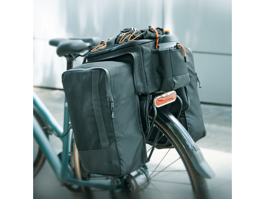 Už žiadny chaos vo vašej taške! Priehradka vzadu, vnútorná prepážka a sieťovaná priehradka v hornej časti tašky vytvárajú poriadok a umožňujú rýchly prístup. Vrch je možné úplne otvoriť pomocou zipsu Easyzip. Dvojitá sieťovaná kapsa pojme ďalšie drobnosti. Reflexné pútka sú pripevnené na prednej a zadnej strane pre lepšiu viditeľnosť v cestnej premávke. Robustná rukoväť a ramenný popruh uľahčujú prepravu tašky, aj keď bicykel nepoužívate. Rozsiahlu výbavu dopĺňa praktický nepremokavý obal.