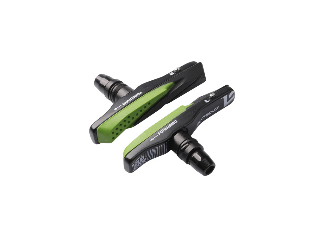 Asymetrické brzdové špalky 72 mm s vyměnitelnými 2-směsovými gumičkami a inbusovou matkou, určené pro MTB a Cross/Trekking V-brzdy.