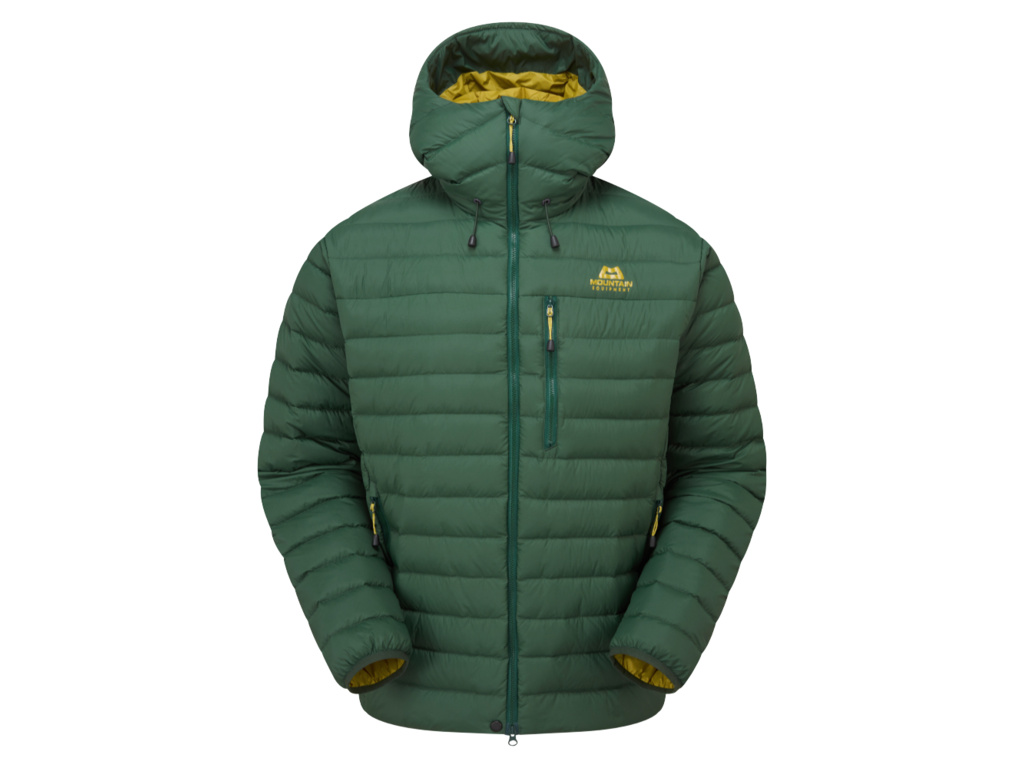 Lehká péřová bunda s kapucí plněná 100% recyklovaným peřím a ušitá ze 100% recyklované látky. To je model MOUNTAIN EQUIPMENT Earthrise.