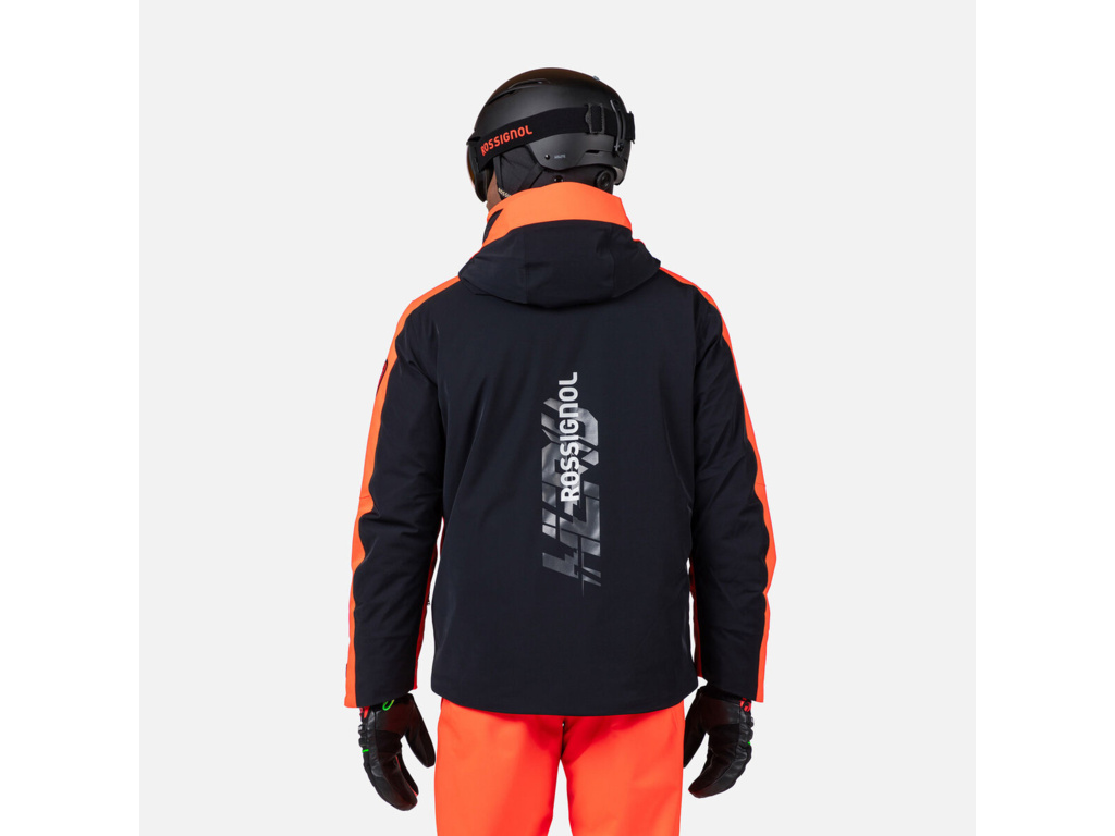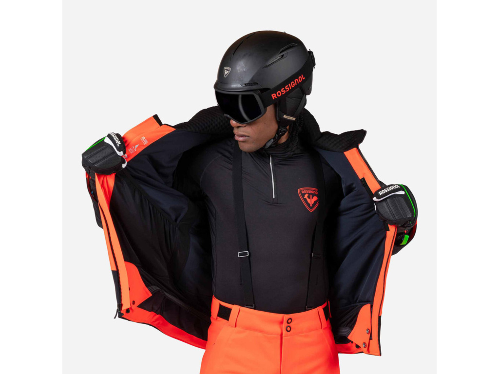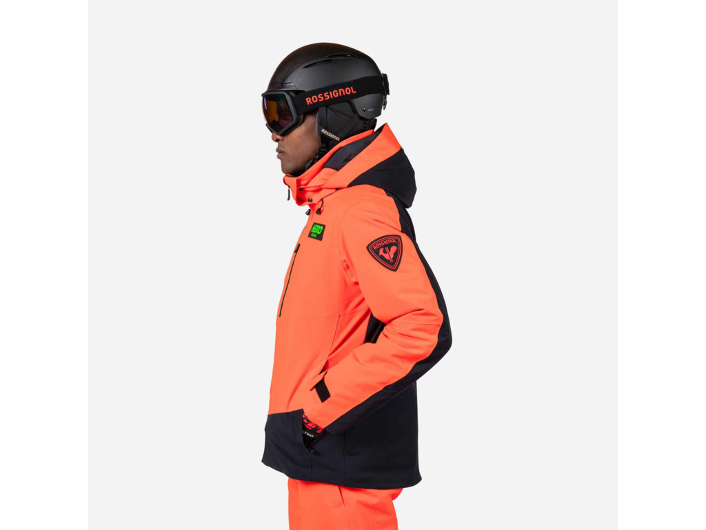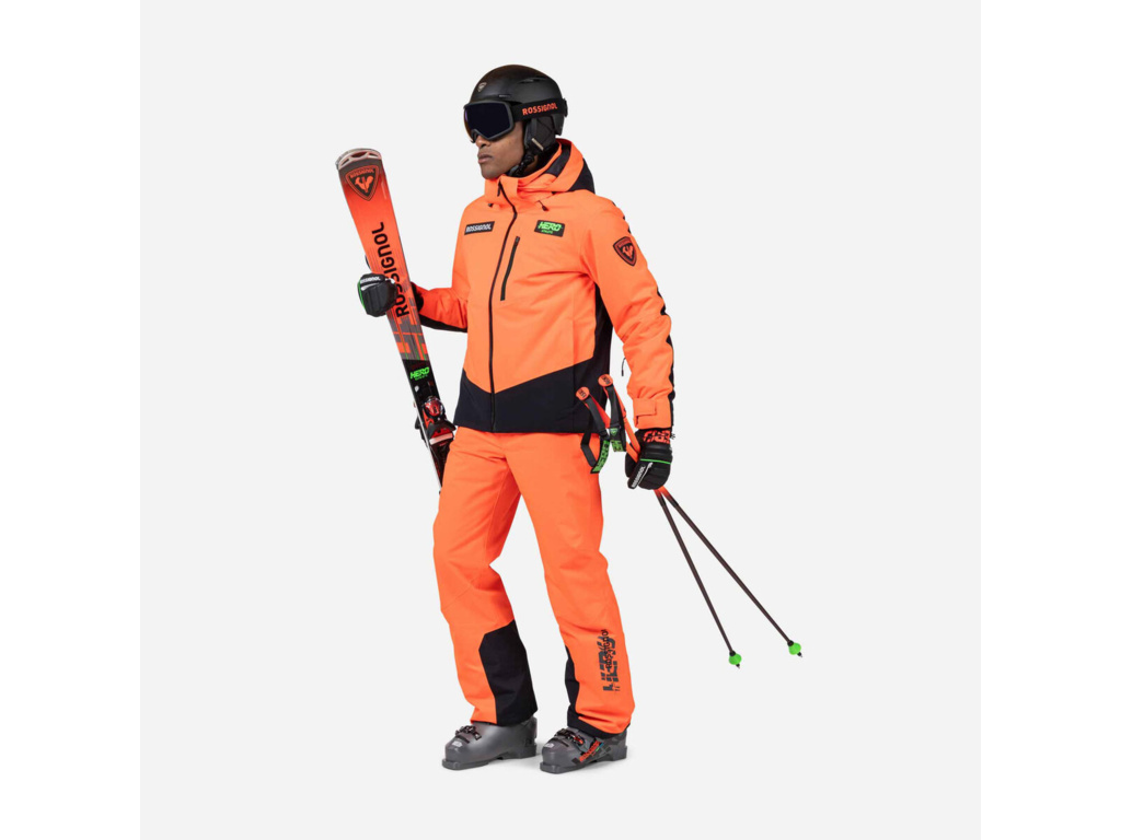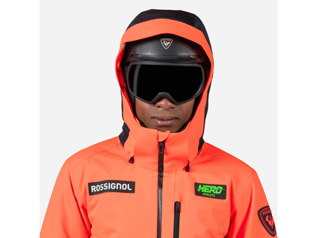 Detaily: Bunda má rovný střih s prostorem pro vrstvení. Praktičnost doplňují vestavěný sněhový pás, strečové manžety s poutky na palec, větrací otvory na zip a hadřík na brýle. Grafika Hero odráží poselství Rossignolu o rychlosti.