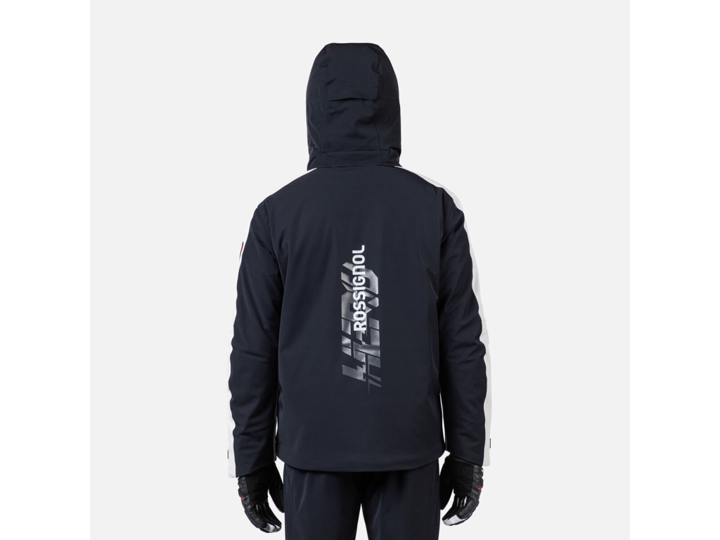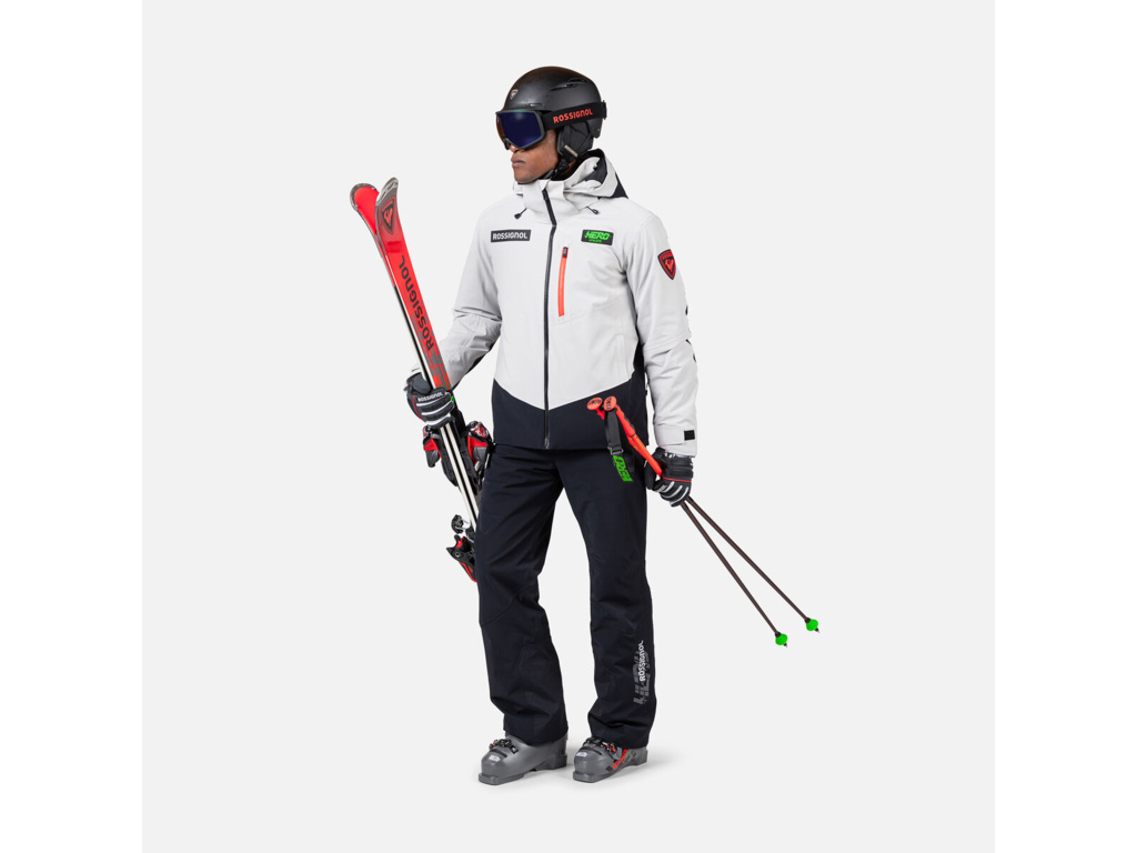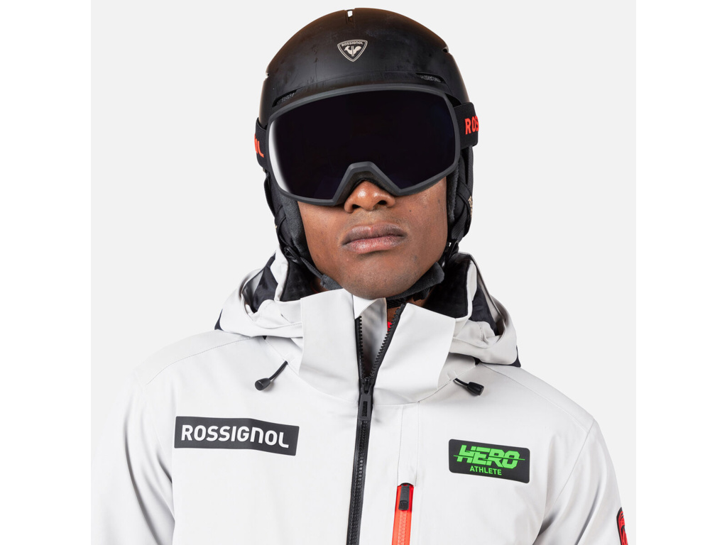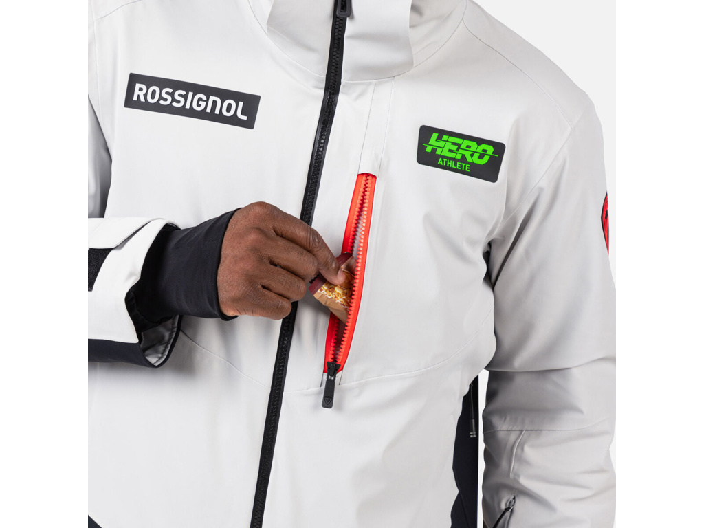 Detaily: Bunda má rovný střih s prostorem pro vrstvení. Praktičnost doplňují vestavěný sněhový pás, strečové manžety s poutky na palec, větrací otvory na zip a hadřík na brýle. Grafika Hero odráží poselství Rossignolu o rychlosti.