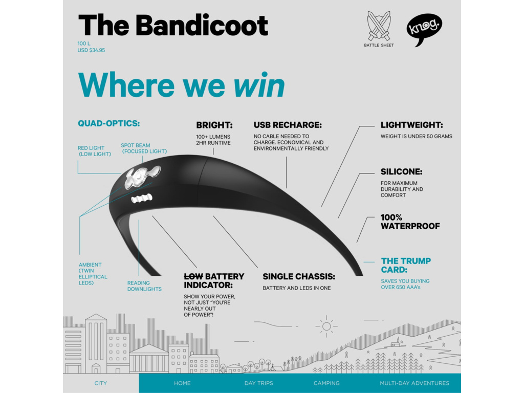 Bandicoot je iná než všetky ostatné čelovky. Je to ľahká a minimalistická, USB nabíjacia silikónová čelová svietidlo. Bez objemných náhradných batérií.