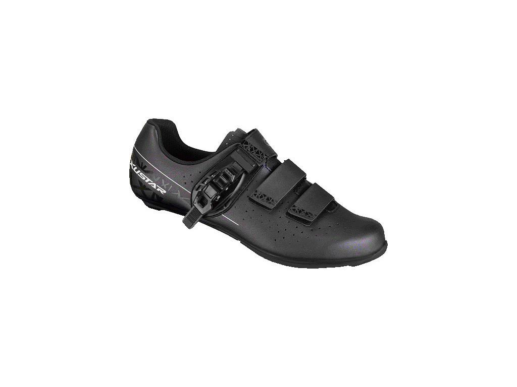Športové cestné tretry Exustar. Tvarovaný, pohodlný zvršok z PU kože s priedušnou sieťovinou a sponou Microlock. Podrážka z nylonu a kompozitných sklenených vlákien má zabudované vetracie otvory Air Control, ktoré vás ochladia, a protišmykové polstrovanie je pripravené, keď sa vaše nohy dotknú zeme.Zvršok: PU koža, priedušná sieťovina.Zapínanie: pracka MicroLock, remienky na suchý zips.Podrážka: kompozit z nylonu a sklenených vlákien s prieduchmi Air Control, stielka z TPU.Stielka Ergonomický dizajn klenby umývateľný EVA. Rozhranie: 3 otvory na skrutky.