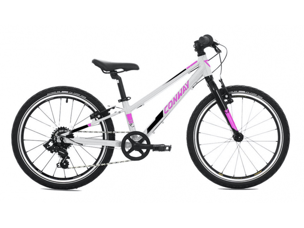 CONWAY MS 200 je detský bicykel na 20-palcových kolesách, vytvorený s ohľadom na čo najnižšiu hmotnosť a čo najjednoduchšie ovládanie. Ľahký hliníkový rám s pevnou hliníkovou vidlicou je osadený komponentmi Shimano so 7 prevodmi, spoľahlivými ráfikovými brzdami a ľahkými hliníkovými doplnkami. Navyše je dizajn modelu ladený do veselých hravých farieb, takže si bicykel malí športovci zamilujú!