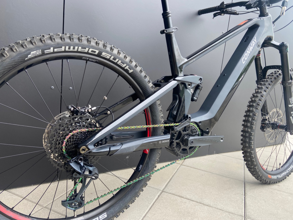 Najvyšší model celoodpruženého elektrobicykla Conway Xyron S 927 ponúka to najlepšie, čo si viete predstaviť. Celokarbónový rám je vybavený výkonným stredovým motorom Bosch CX 4. generácie a integrovanou batériou s kapacitou 625 Wh. Xyron S 927 je osadený karbónovými kolesami DT Swiss HXC 1200 Spline a špičkovým odpružením Rock Shox Pike Ultimate / Super Deluxe Ultimate so zdvihom 150/140 mm. Vrcholom je 12-rýchlostná bezdrôtová prehadzovačka Sram X01 AXS s 12 prevodmi, ktorú dopĺňa diaľkovo ovládaná teleskopická sedlovka Reverb AXS.
