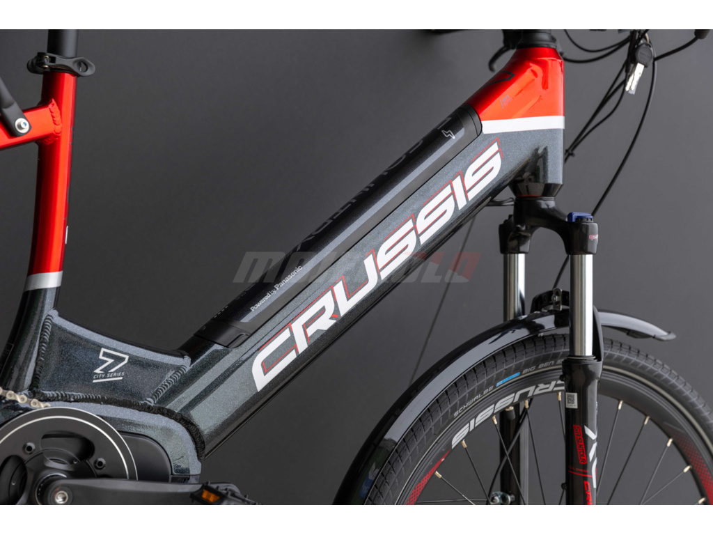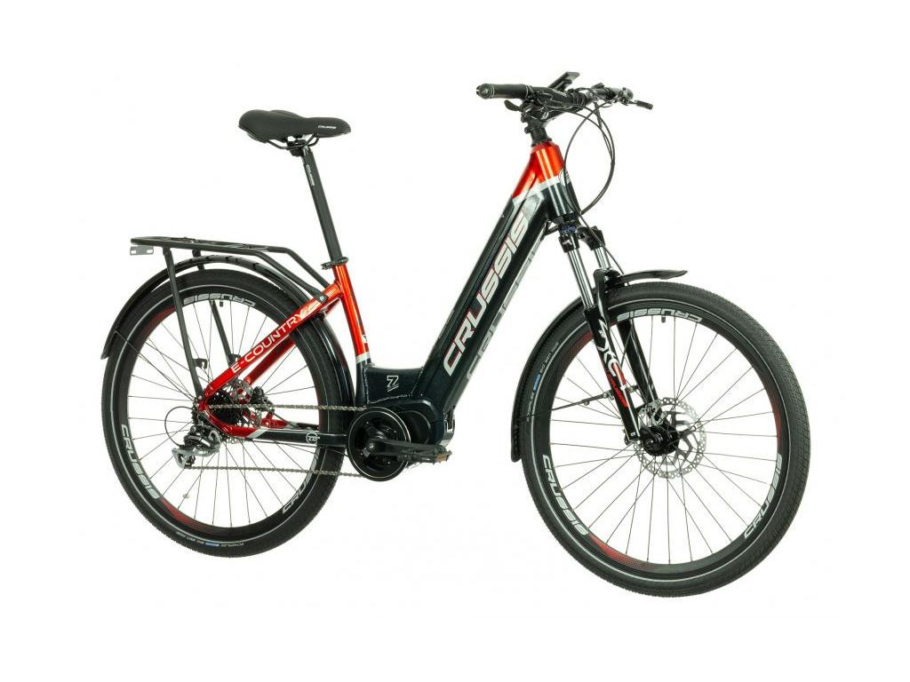 Mestský elektrobicykel Crussis e-Country 7.7 so stredovým motorom Bafang Max Drive M400 a integrovanou batériou s kapacitou 522 Wh. Vďaka nízkej rámovej rúrke je nastupovanie a zosadanie z bicykla veľmi pohodlné aj v bežnom civilnom oblečení.