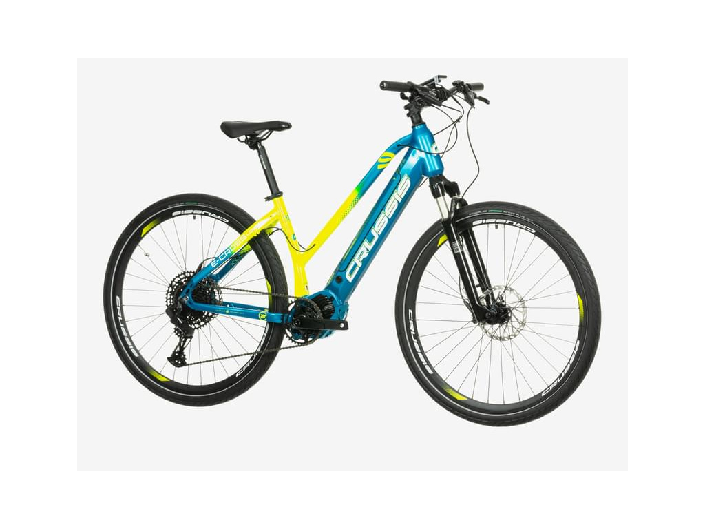 Krosové elektrokolo Crussis e-Cross Low 9.8-M s výkonným středovým motorem Bafang M500 a baterií 720 Wh. Osazeno je prémiovou vzduchovou vidlicí Rock Shox Paragon Gold RL a komponenty Sram SX Eagle s 12 převody.