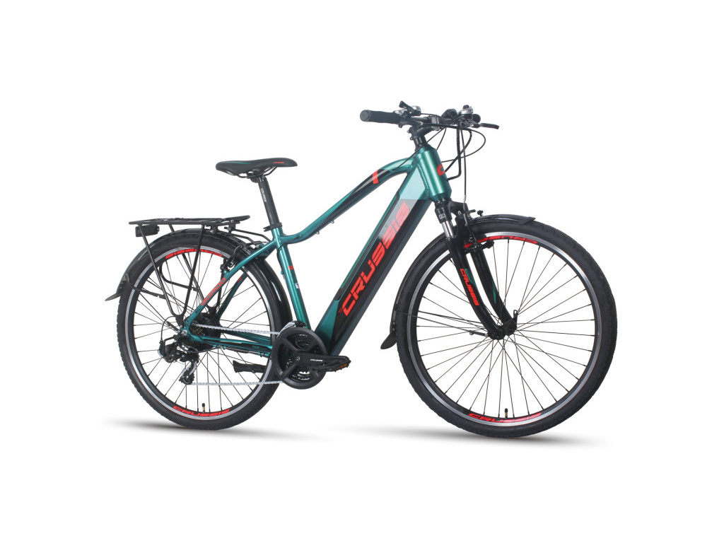 Pánsky trekingový elektrobicykel Crussis e-Gordo 1.8-S s motorom Bafang v zadnom náboji a integrovanou batériou s kapacitou 630 Wh na každodenné cestovanie v meste a na vidieku. K štandardnej výbave patria blatníky, zadný nosič a praktický stojan.