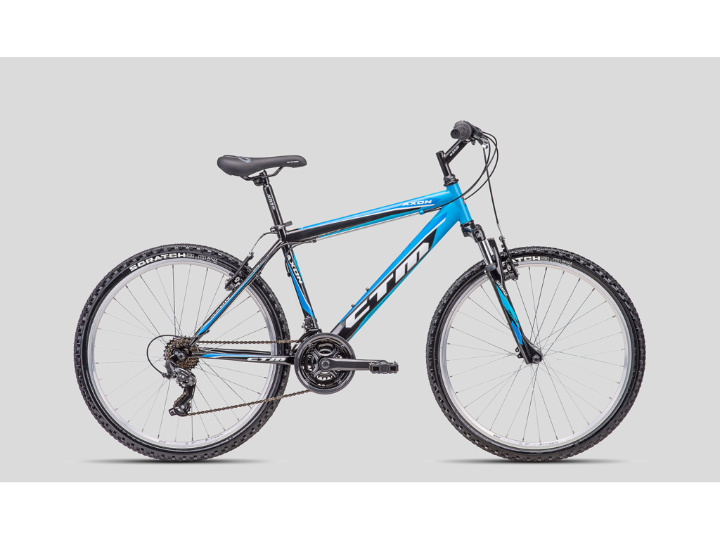 CTM Axon je základný pánsky horský bicykel pre príležitostných cyklistov. Základom je odolný oceľový rám s odpruženou vidlicou Suntour a komponentmi Shimano s 3x6 prevodmi a ráfikovými brzdami.