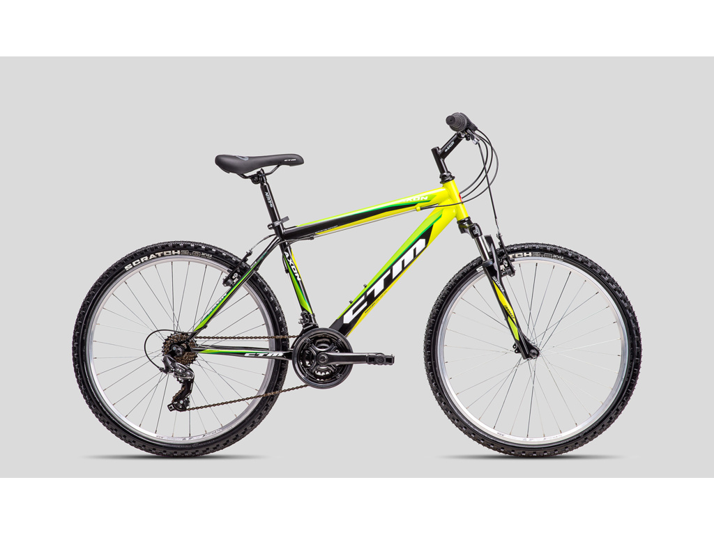 CTM Axon je základný pánsky horský bicykel pre príležitostných cyklistov. Základom je odolný oceľový rám s odpruženou vidlicou Suntour a komponentmi Shimano s 3x6 prevodmi a ráfikovými brzdami.