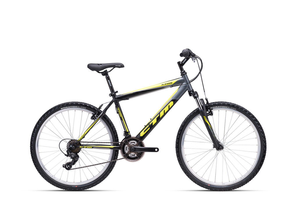 CTM Axon je horský bicykel pre nenáročných jazdcov. Oceľový rám je vybavený odpruženou vidlicou Suntour, komponentmi Shimano s prevodmi 3x7 a ráfikovými brzdami Alhonga.