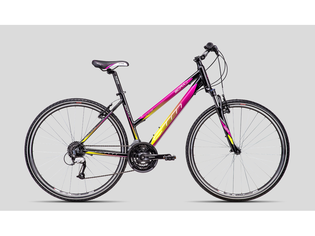 CTM Bora 1.0 je dámsky crossový bicykel na rekreačné použitie, ideálny na jazdu po spevnených a nespevnených cestách. Hliníkový rám je vybavený odpruženou vidlicou Suntour s uzamykateľnými, spoľahlivými V-brzdami a prevodmi Shimano 3x8.