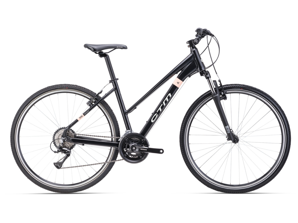 Dámské krosové kolo CTM Bora 1.0 pro jízdu po zpevněných cestách nebo po silnici. Díky snížené vrchní trubce je nastupování jednodušší. Kvalitními komponenty Shimano, odpružená vidlice Suntour.