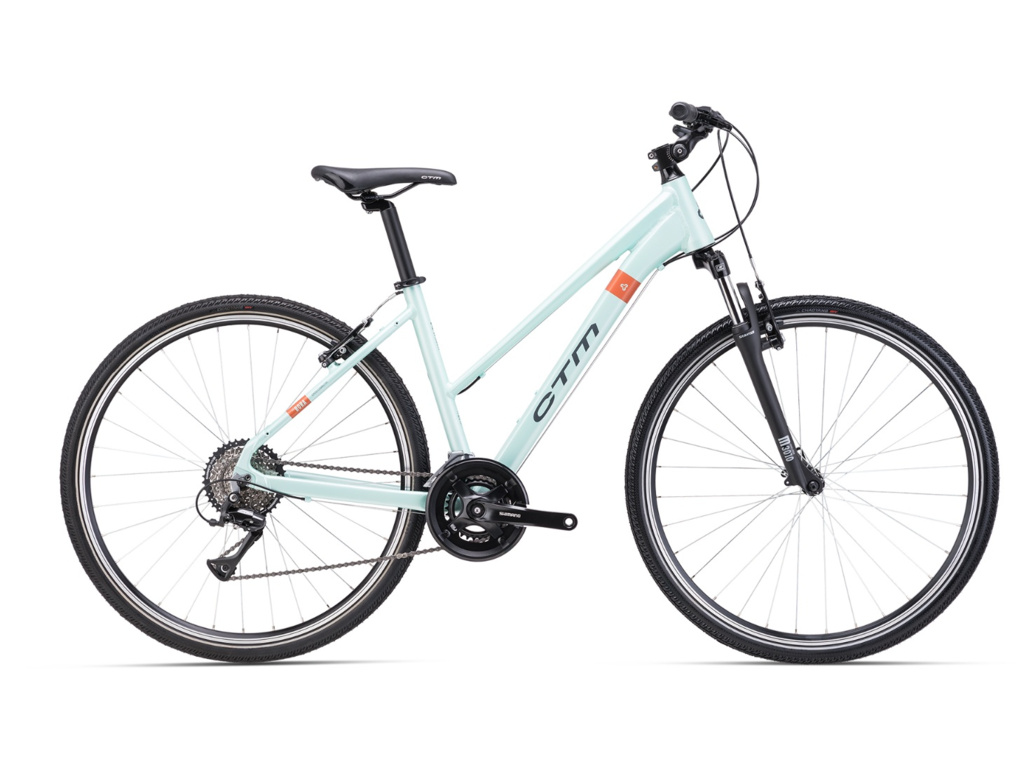 Dámské krosové kolo CTM Bora 1.0 pro jízdu po zpevněných cestách nebo po silnici. Díky snížené vrchní trubce je nastupování jednodušší. Kvalitními komponenty Shimano, odpružená vidlice Suntour.