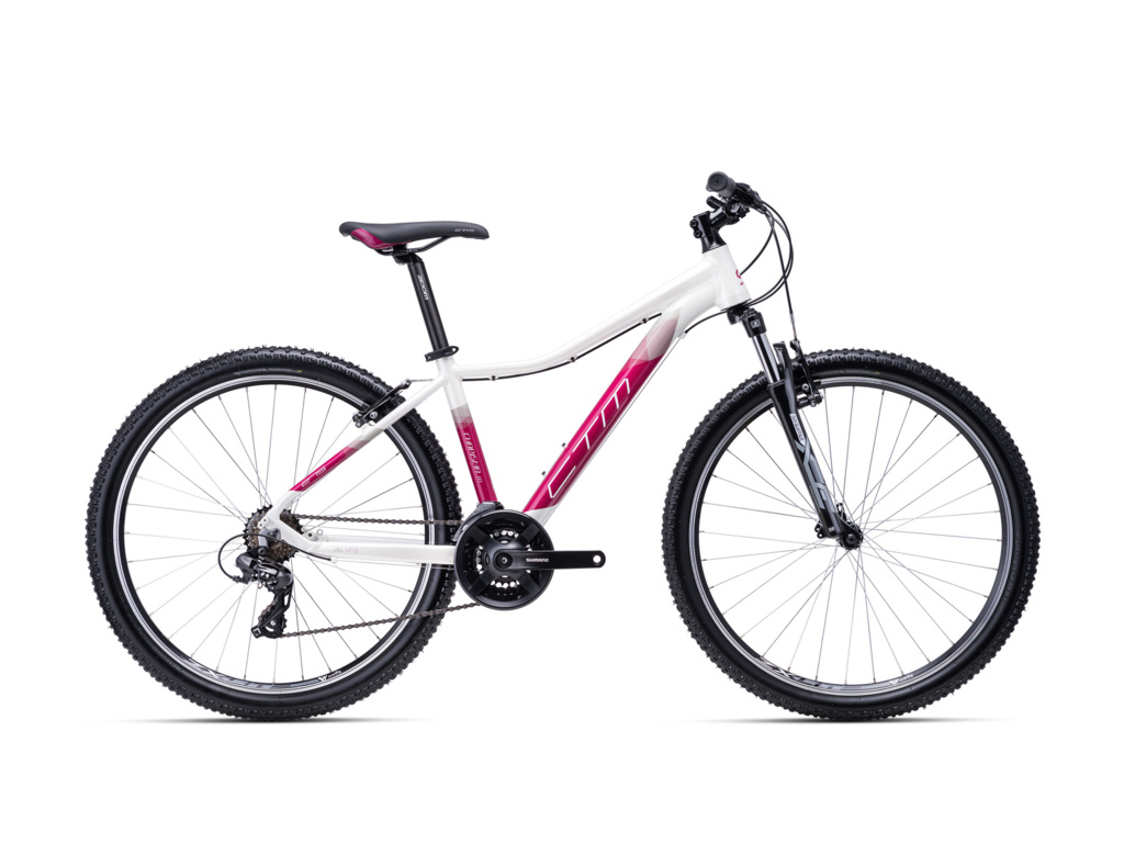 CTM Charisma 1.0 je elegantný dámsky horský bicykel vhodný pre rekreačných cyklistov. Ľahký hliníkový rám je vybavený odpruženou vidlicou Suntour XCE28, prevodmi Shimano 3x7 a spoľahlivými ráfikovými brzdami Alhonga.