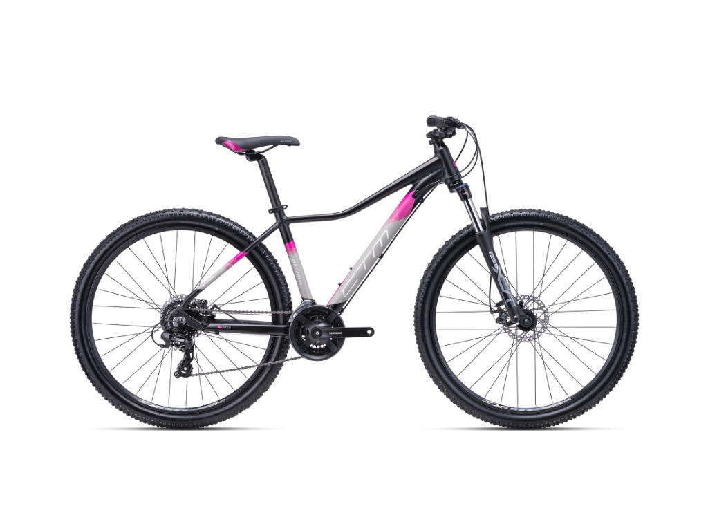 Dámsky horský bicykel v elegantnom dizajne, vhodný pre rekreačných cyklistov. Ľahký hliníkový rám na 27,5-palcových kolesách, vybavený odpruženou vidlicou Suntour XCT30, prevodmi Shimano 3x8 a mechanickými kotúčovými brzdami Hayes.