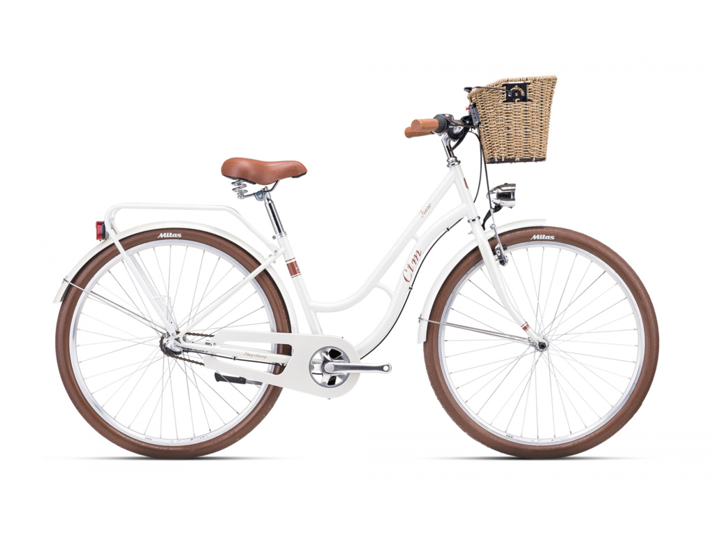 CTM Fiore je dámsky bicykel v krásnom retro dizajne, ktorý sa hodí do mesta, ale aj na rodinné výlety na cyklotrasy. Tento model, okrem praktickej zníženej hornej rámovej trubky, ktorá vám uľahčí výstup aj nástup, je už od základu vybavený nosičom, blatníkmi, predným aj zadným svetlom, štýlovým prúteným košom na vaše nákupy a radením v náboji pre minimálnu údržbu. Zaručene vás poteší aj sedlo CTM lady comfort pre vaše maximálne pohodlie.