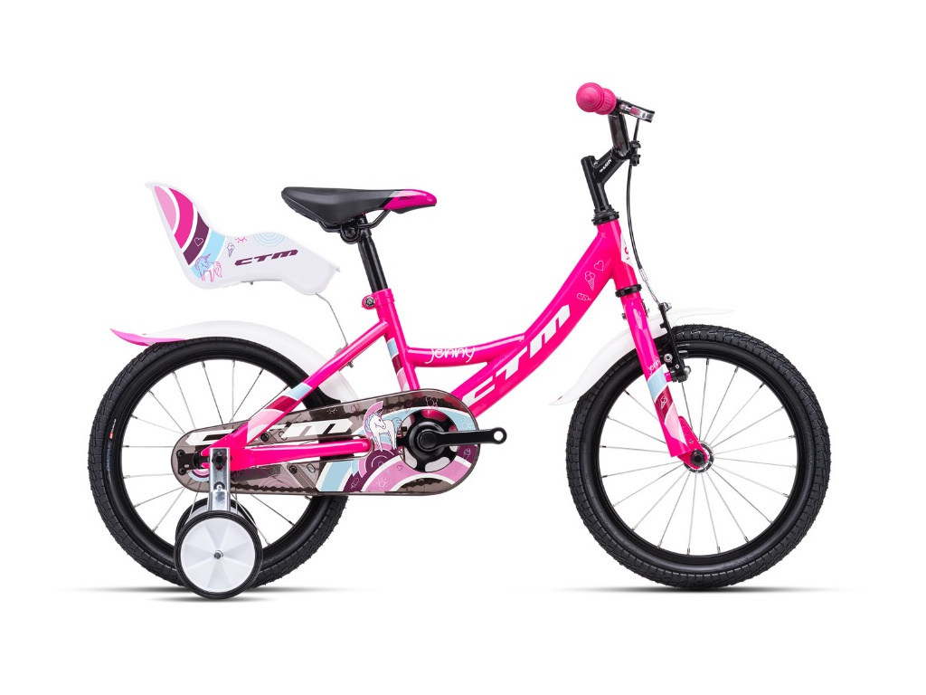 CTM Jenny je 16-palcový dievčenský bicykel pre deti s výškou postavy od 100 do 120 cm. Štandardne sa dodáva s vyváženými kolesami, plastovými blatníkmi a bezpečnostným krytom reťaze. Mladé dámy ocenia sedadlo pre bábiky.
