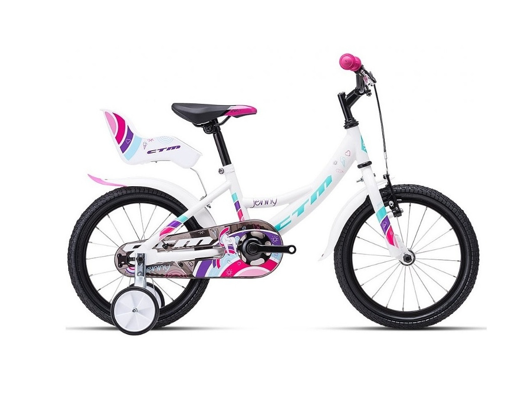 CTM Jenny je 16-palcový dievčenský bicykel pre deti s výškou postavy od 100 do 120 cm. Štandardne sa dodáva s vyváženými kolesami, plastovými blatníkmi a bezpečnostným krytom reťaze. Mladé dámy ocenia sedadlo pre bábiky.