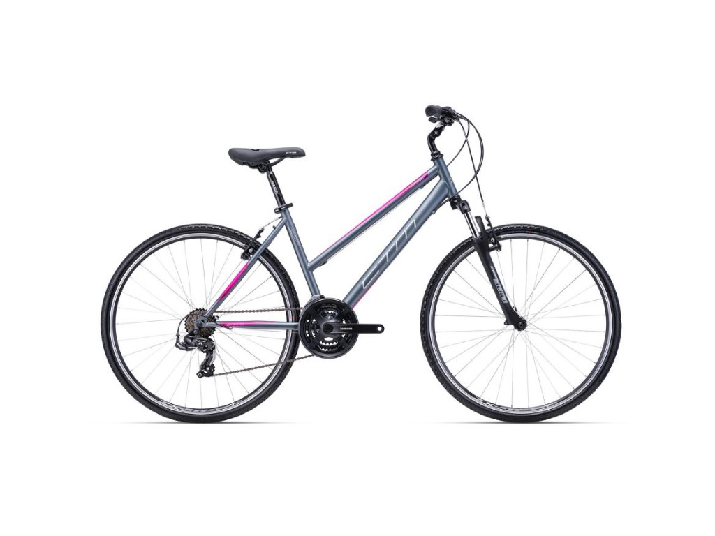Dámsky crossový bicykel CTM Jessie so zníženou hornou rámovou rúrkou pre jednoduchšie nasadanie a zosadanie. Oceľový rám, odpružená vidlica Suntour M3010, komponenty Shimano s prevodmi 3x7 a užšími plášťami pre ľahkú jazdu na trailoch.