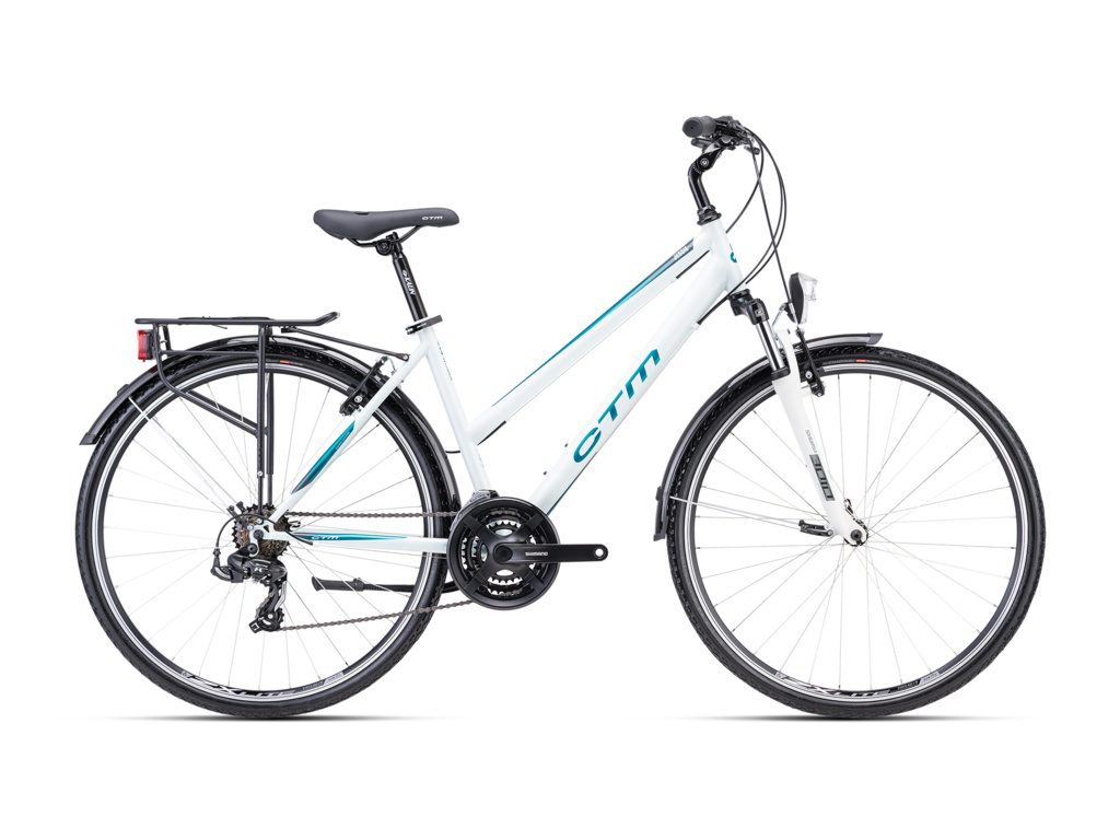 Dámsky crossový bicykel CTM Jessie so zníženou hornou rámovou rúrkou pre jednoduchšie nasadanie a zosadanie. Oceľový rám, odpružená vidlica Suntour M3010, komponenty Shimano s prevodmi 3x7 a užšími plášťami pre ľahkú jazdu na trailoch.