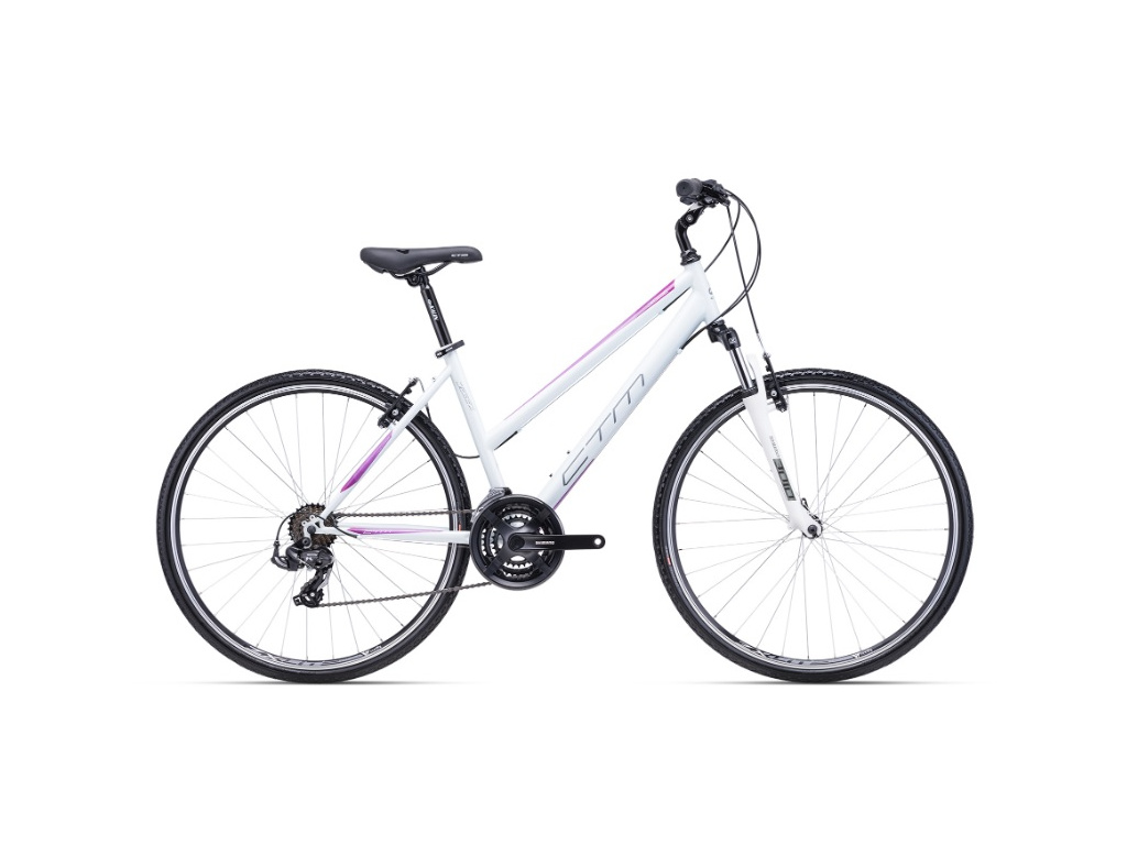 Dámsky crossový bicykel CTM Jessie so zníženou hornou rámovou rúrkou pre jednoduchšie nasadanie a zosadanie. Oceľový rám, odpružená vidlica Suntour M3010, komponenty Shimano s prevodmi 3x7 a užšími plášťami pre ľahkú jazdu na trailoch.