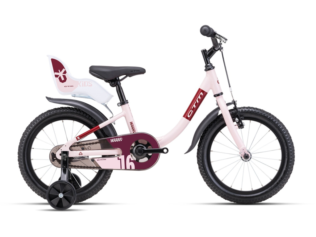 CTM Jenny je 16palcové dívčí kolo pro děti s výškou postavy od 100 do 120 cm. Má pevné ocelové tělo pro dobrou stabilitu a standardně je dodáváno s balančními kolečky, plastovými blatníčky a bezpečnostním krytem řetězu. Mladé slečny jistě ocení i sedátko pro panenky.