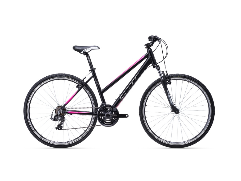 Dámsky crossový bicykel CTM Maxima 1.0 so zníženou hornou rámovou rúrkou pre jednoduchšie nasadanie a zosadanie. Ľahký hliníkový rám, odpružená vidlica Suntour, komponenty Shimano s 3x7 prevodmi a spoľahlivé ráfikové brzdy na jazdu na trailoch.