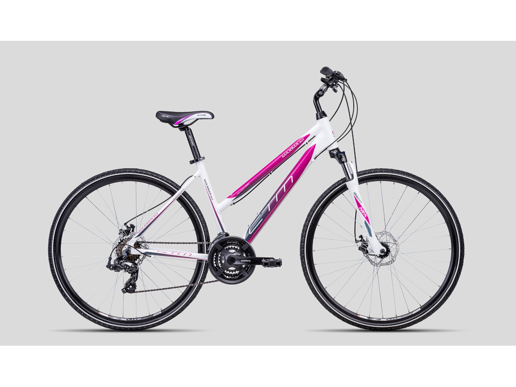 CTM Maxima 3.0 je dámsky krosový bicykel na rekreačné použitie, ideálny na jazdu po spevnených a nespevnených cestách. Hliníkový rám je vybavený odpruženou vidlicou Suntour s uzamykaním, kotúčovými brzdami a radením Shimano s 3x7 prevodmi.