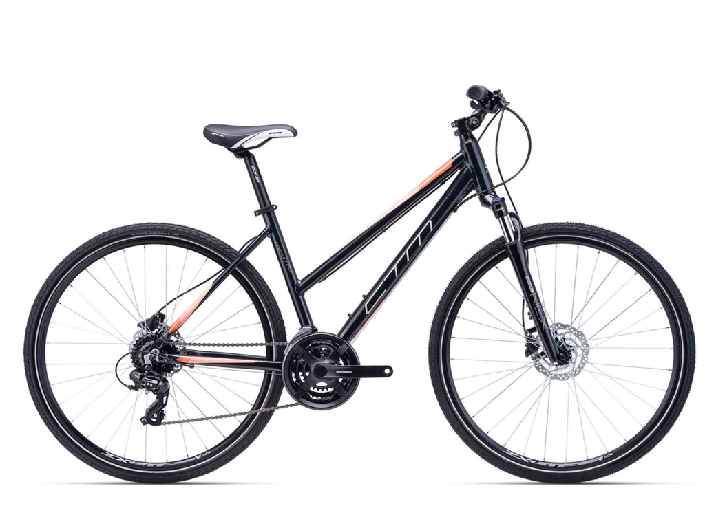 Dámsky crossový bicykel so zníženou hornou rámovou rúrkou na jednoduchšie nasadanie a zosadanie. Ľahký hliníkový rám, odpružená vidlica Suntour s uzamykaním, komponenty Shimano s prevodmi 3x8 a hydraulické kotúčové brzdy pre svižnú jazdu.